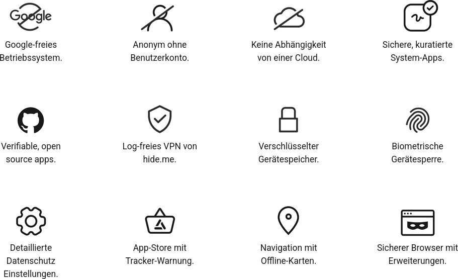 Basierend auf dem freien, quelloffenen Android ohne Google-Apps und -Dienste und ohne Abhängigkeit von einer Cloud.